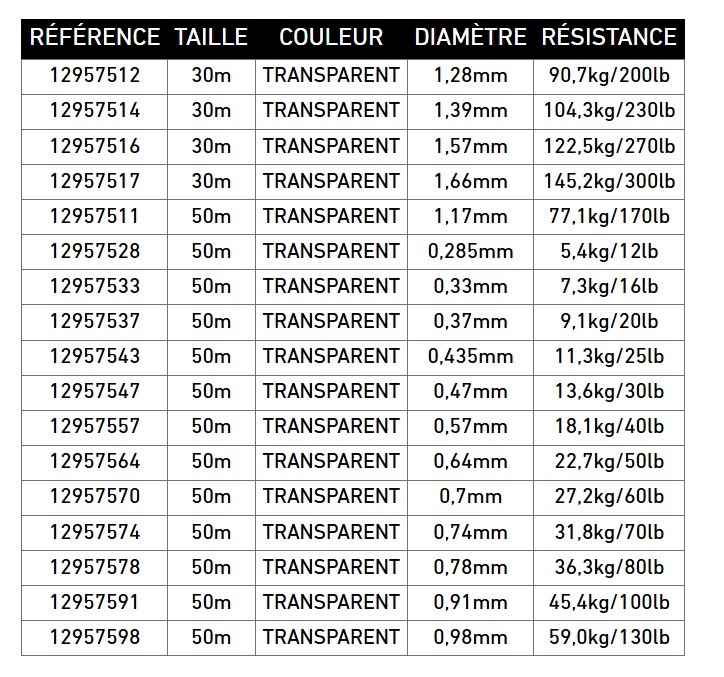 100lb 0.91mm, 130lb 0.98mm, 170lb 1.17mm, 200lb 1.28mm, 230lb 1.39mm, 60lb 0.70mm, 80lb 0.78mm, 50LB 0.64MM |